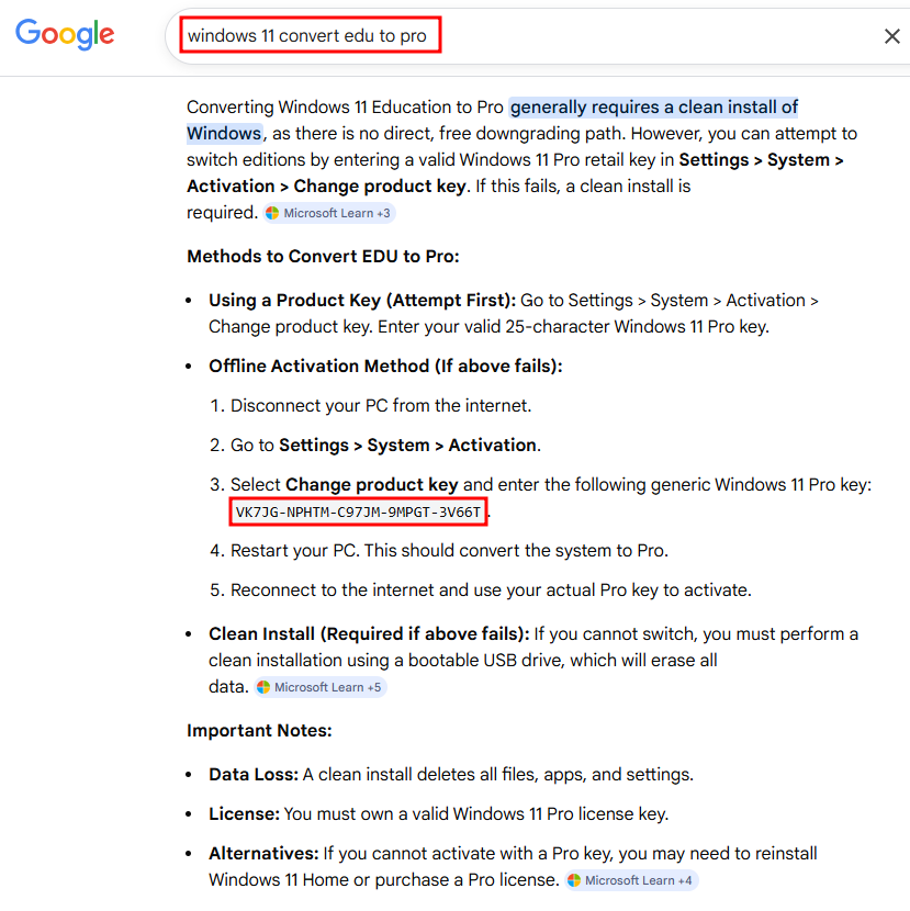 Czy wiecie, że generyczny klucz produktu Windows 11 Pro – VK7JG-NPHTM-C97JM-9MPGT-3V66T umożliwia aktywację systemu? Należy podkreślić, że korzystanie wyłącznie z tego klucza nie jest legalne, lecz bywa wymagane w sytuacjach takich jak konwersja systemu z wersji Education do Pro. Klucz ten służy wyłącznie do instalacji systemu oraz do jego testowania.