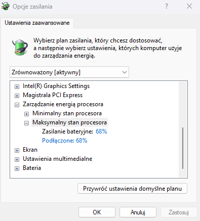Zmian dokonuje się w poprzez wejście do Panel sterowania -> Opcje zasilania -> Wybierz moment wyłączenia ekranu -> Zmień zaawansowane ustawienia zasilania -> Zarządzanie energią procesora -> Maksymalny stan procesora i ustawienie tam zamiast 100% to 68%.